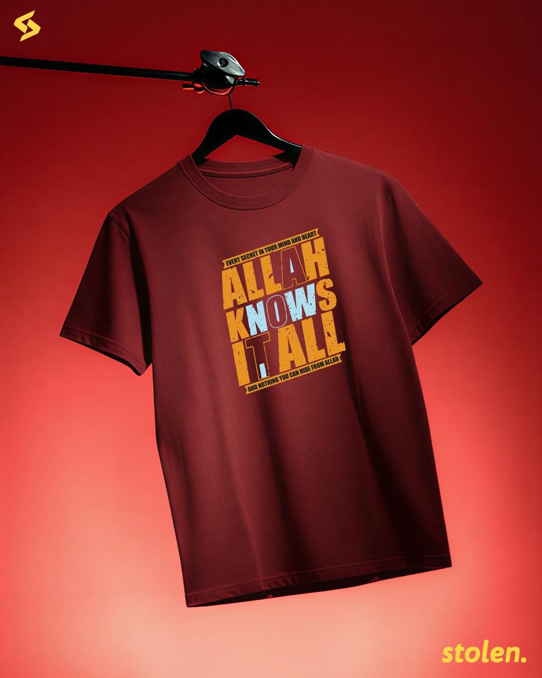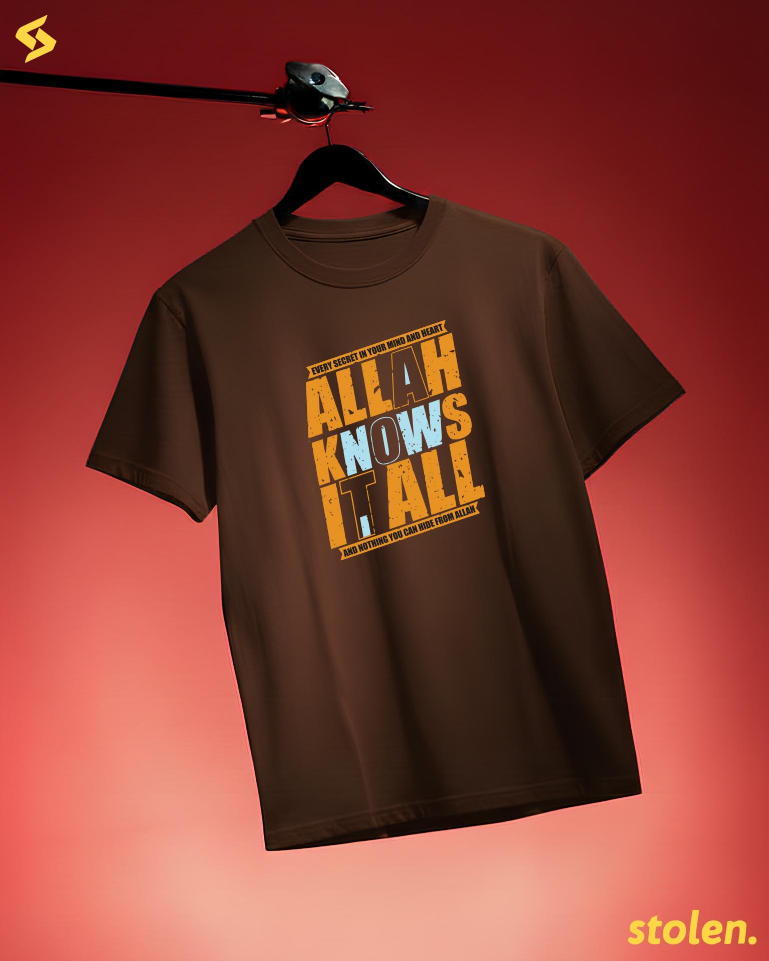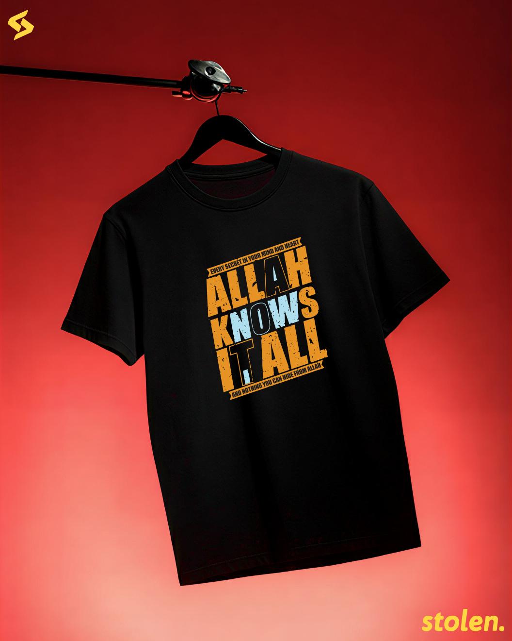 Allah Knows It All Islamic T-ShirtRegular fit MENS t-shirt crafted from premium 180+ GSM 100% cotton, featuring the profound reminder “Allah Knows It All” in elegant Islamic calligraphy-inspired design.