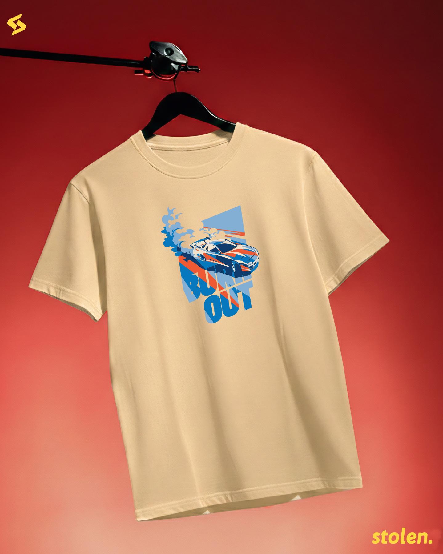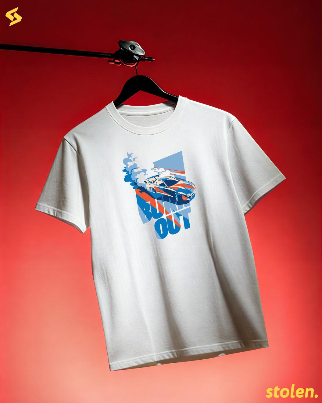 Burnout Car Printed T-ShirtRegular fit unisex t-shirt crafted from premium 180+ GSM 100% cotton, featuring a bold burnout car graphic with tire smoke and drifting vibes for that high-octane street racing energy.